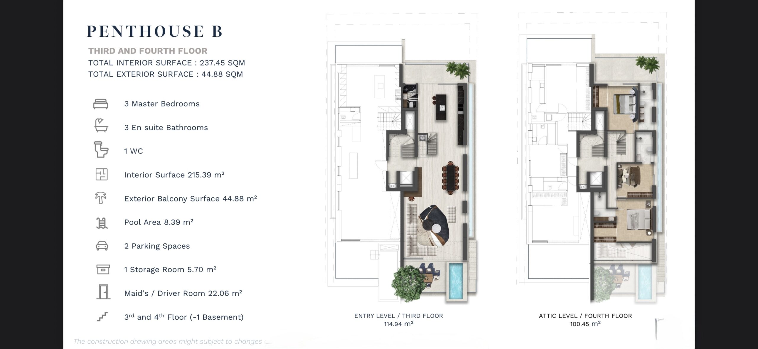 This bright and refined two-level penthouse offers 237 sq.m. of elegant interior space . of private outdoor terraces, highlighted by a stunning private rooftop pool.