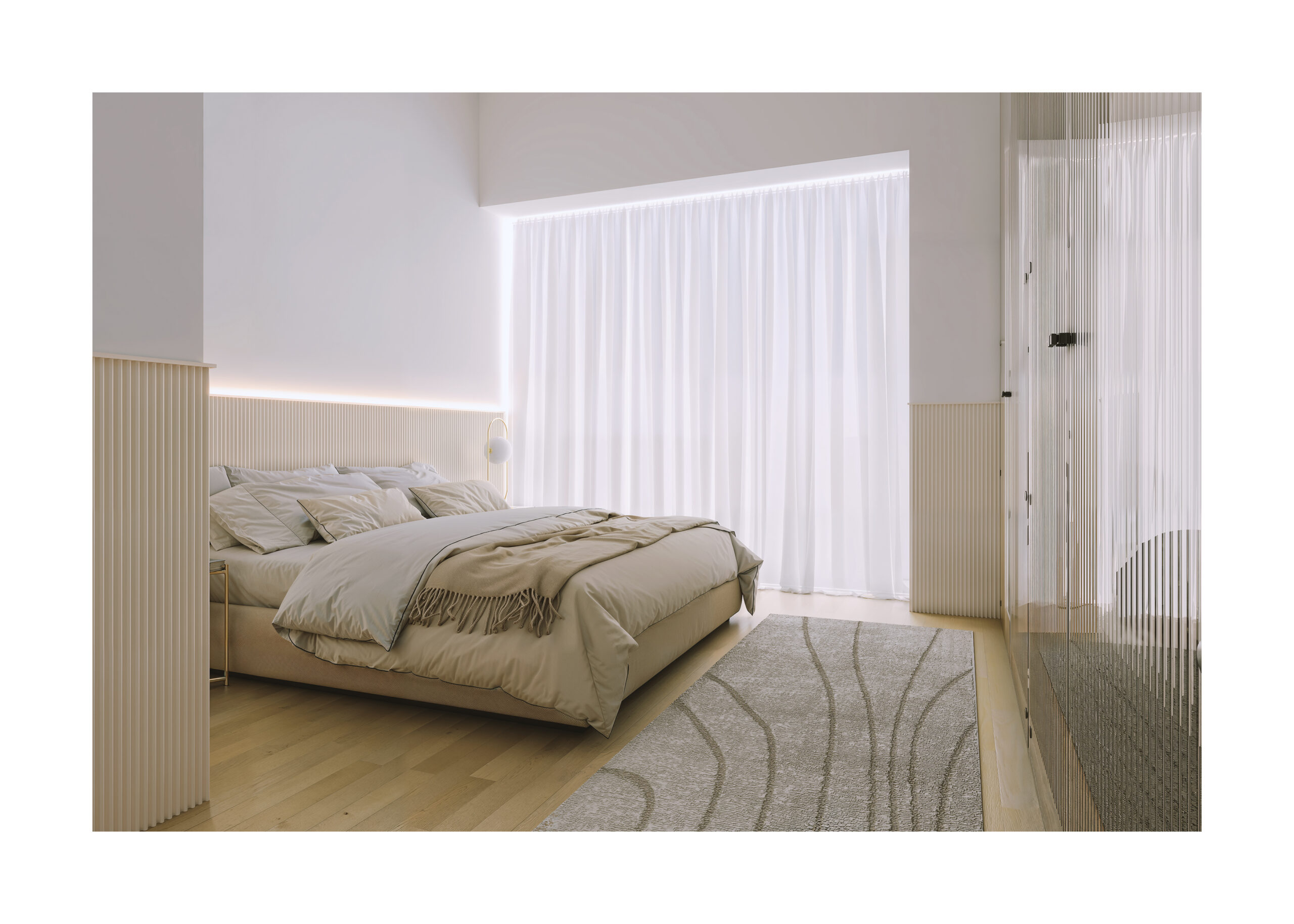 • A dedicated laundry/storage area in the corridor, designed to serve everyday needs without disrupting the clarity and purity of the living spaces.