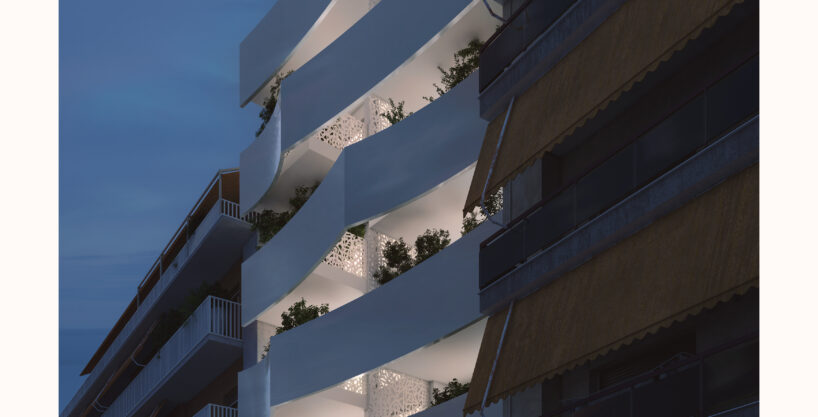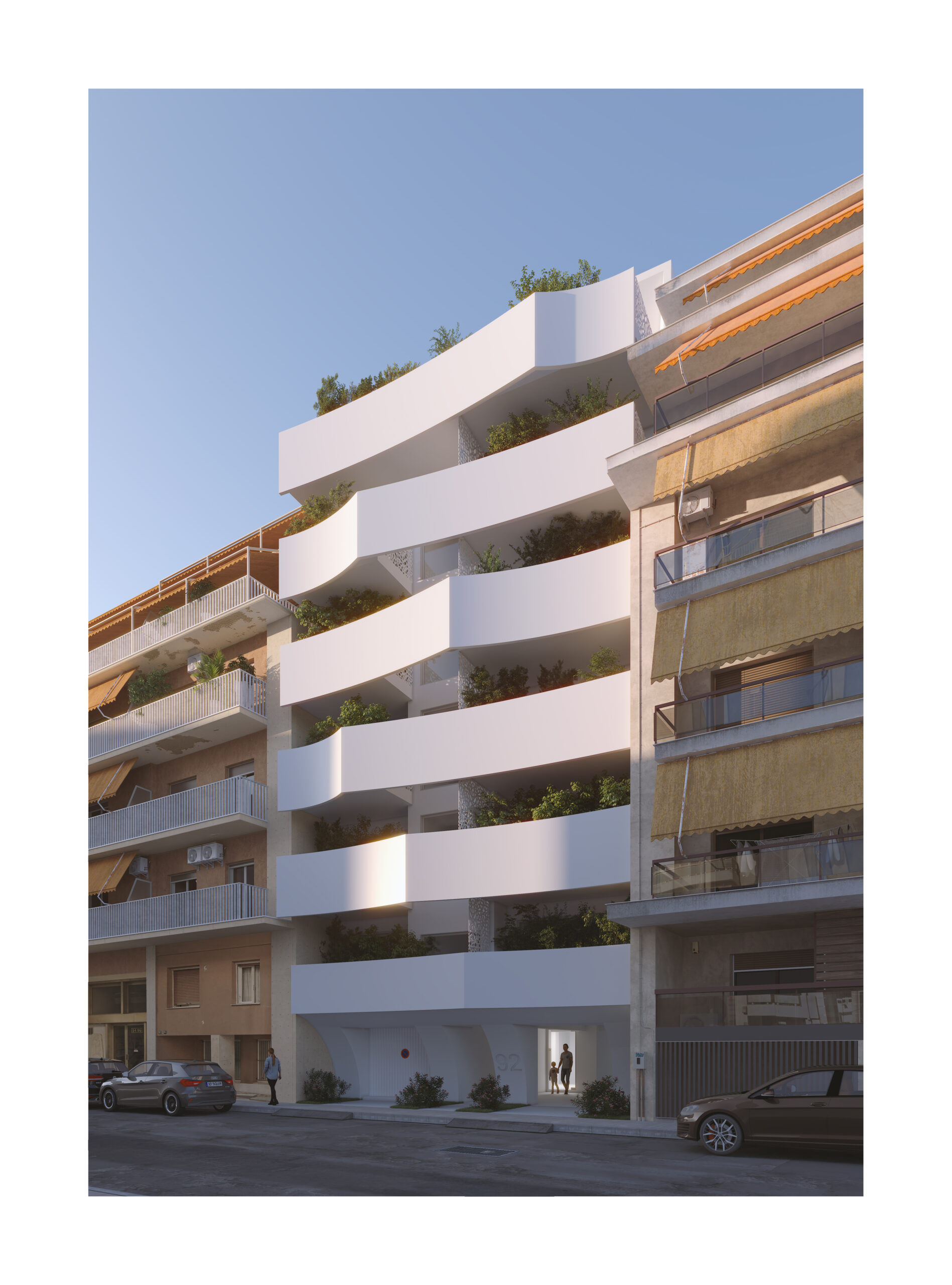 A sculptural pergola-shading structure frames the façade, offering protection from both sun and rain while serving as a strong architectural statement that distinctly elevates the building’s appearance.